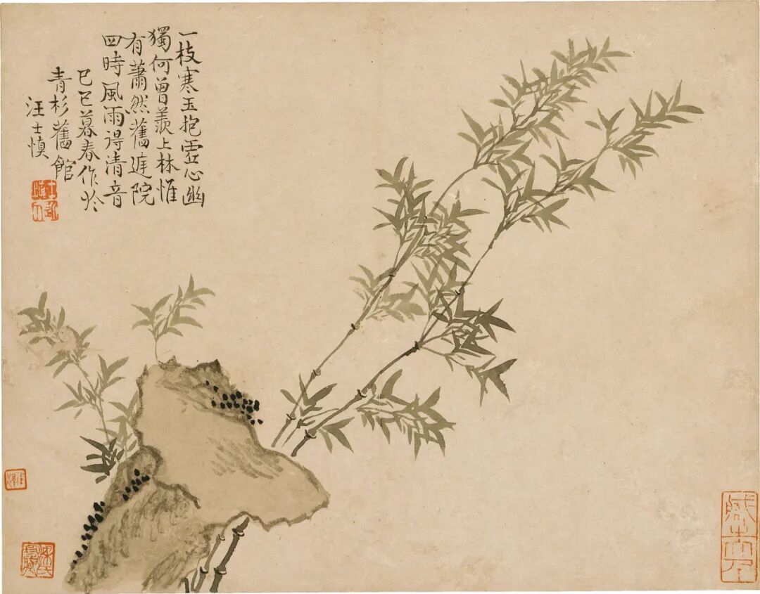 题识:一枝寒玉抱虚心,幽独何曾羡上林。惟有萧然旧庭院,四时风雨得清音。己已暮春作于青杉旧馆。