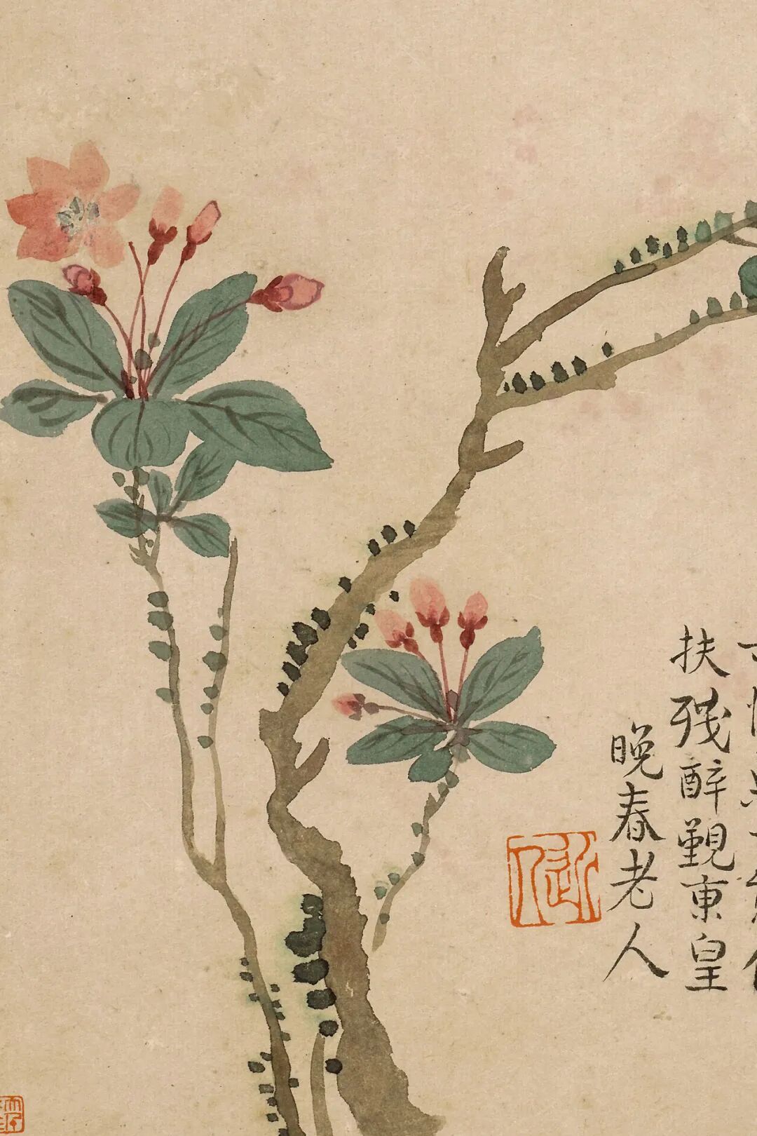 题识:裁红剪绿丽韶光,多少烟丝引蒂长。看到可怜无力态,似扶残醉觐东皇。