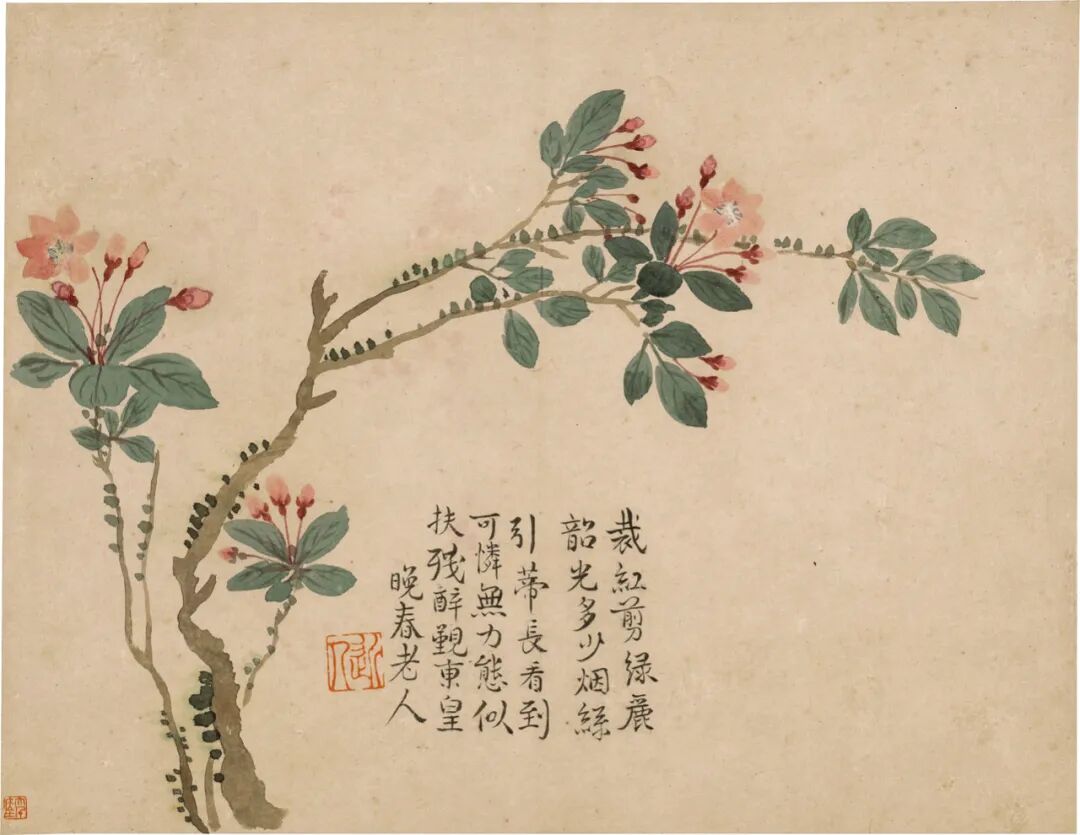 题识:点点胭脂占树梢,绝无风雨上轻绡。曾逢满地抛红粉,不肯随人过板桥。
