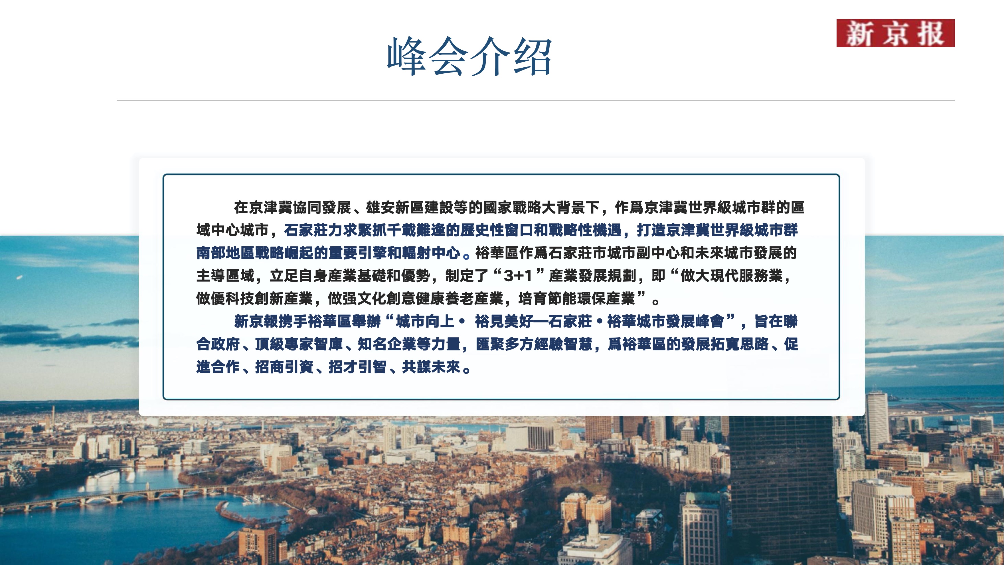 在京津冀协同发展、雄安新区建设等的国家战略大背景下,作为京津冀世界级城市群的区域中心城市,石家庄力求紧抓千载难逢的历史性窗口和战略性机遇,打造京津冀世界级城市群南部地区战略崛起的重要引擎和辐射中心。裕华区作为石家庄市城市副中心和未来城市发展的主导区域,立足自身产业基础和优势,制定了“3+1”产业发展规划,即“做大现代服务业,做优科技创新产业,做强文化创意健康养老产业,培育节能环保产业”。新京报携手裕华区举办“城市向上? 裕见美好—石家庄?裕华城市发展峰会”,旨在联合政府、顶级专家智库、知名企业等力量,汇聚多方经验智慧,为裕华区的发展拓宽思路、促进合作、招商引资、招才引智、共谋未来。