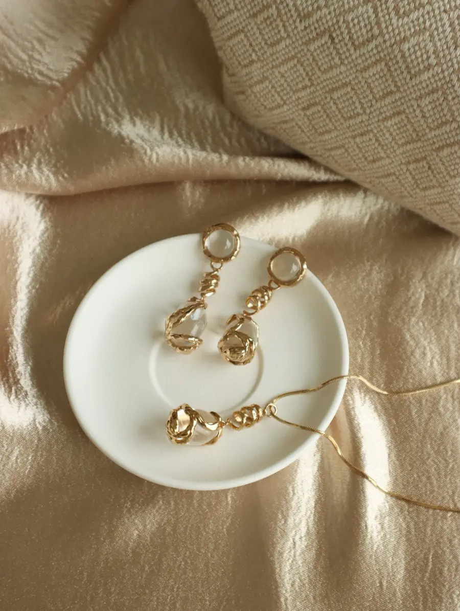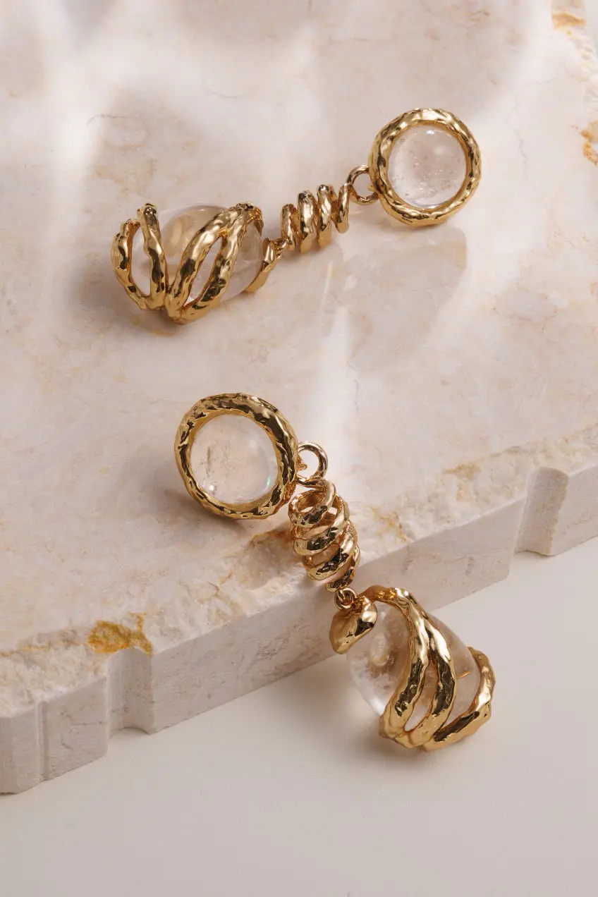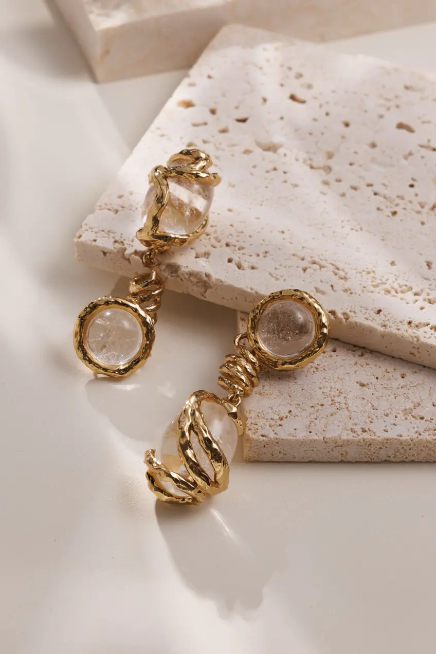 采用宝石绕镶工艺,在天然白水晶外做金属的缠绕镶嵌,充满立体感。保留天然水晶的自然矿石内含物,更加具有天然有机的气息。