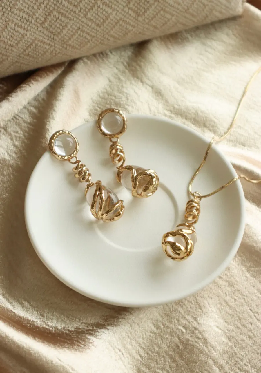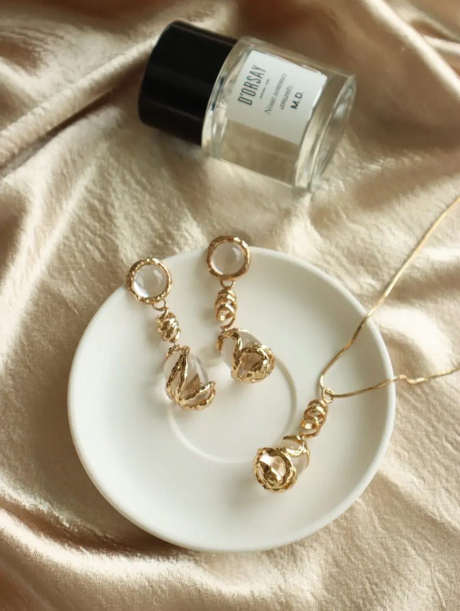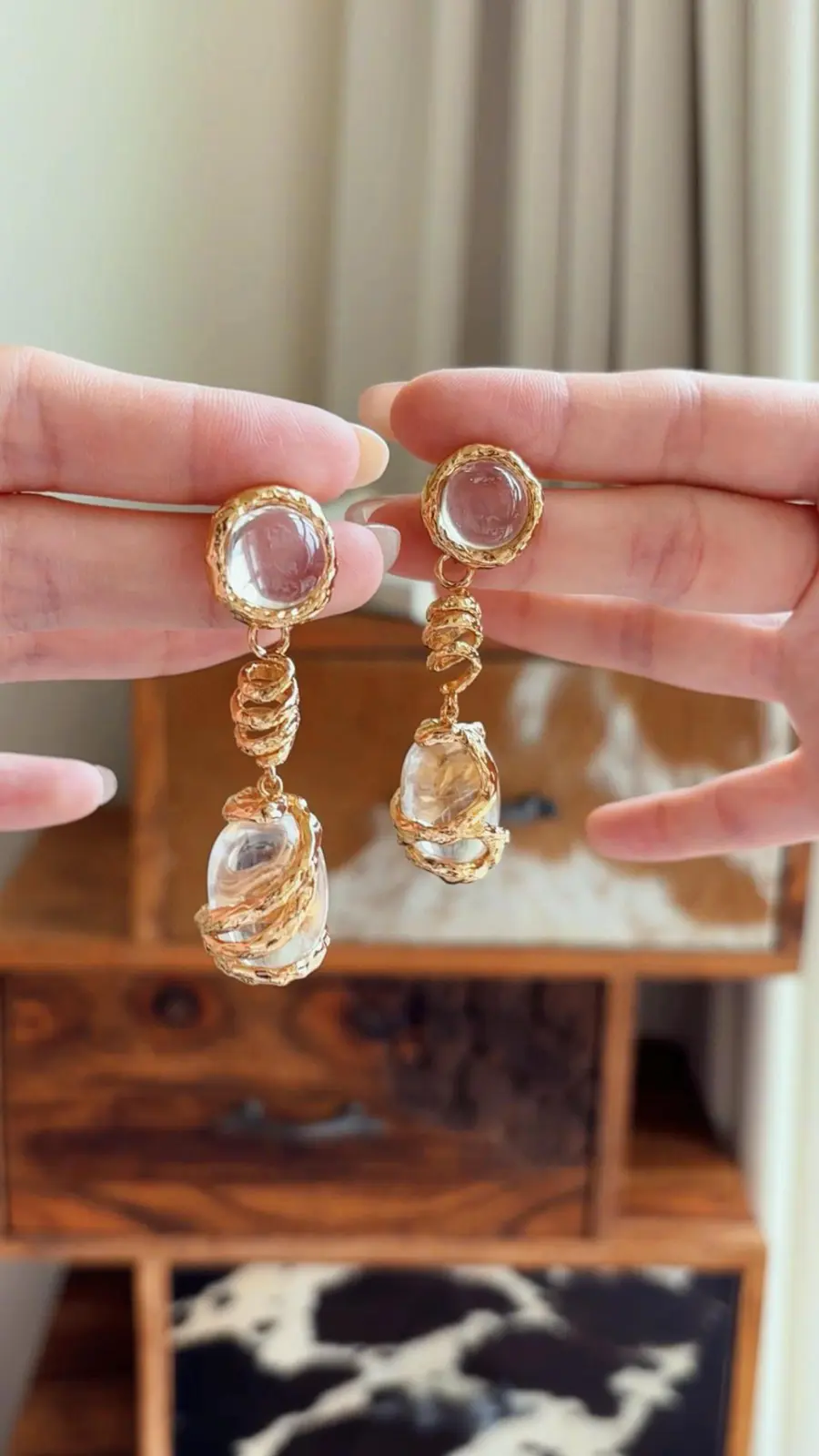 采用宝石绕镶工艺,在天然白水晶外做金属的缠绕镶嵌,充满立体感。保留天然水晶的自然矿石内含物,更加具有天然有机的气息。
