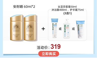 除了以上好物,今天还给大家带来了能上山下海、强力防护的安耐晒防晒!限时319元抢价值超600元的:安耐晒60ml*2+比亚芬面霜/沐浴露/护手霜3选1组合,数量有限,想入的小伙伴拼劲手速抓紧儿囤起来吧,毕竟我们内部小哥哥小姐姐们已经囤好了存货才放过它上架的!