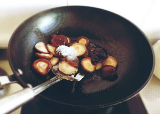 2、锅中补点底油,放一个大料瓣(大料瓣变成灰褐色后),放入葱姜蒜爆香,放入香菇煸炒,香菇炒褶皱,放入1勺料酒(喝汤匙勺),2勺生抽,半勺老抽,把汤汁炒的粘稠,香菇上都挂满汁,放入1平勺白糖,炒均匀;