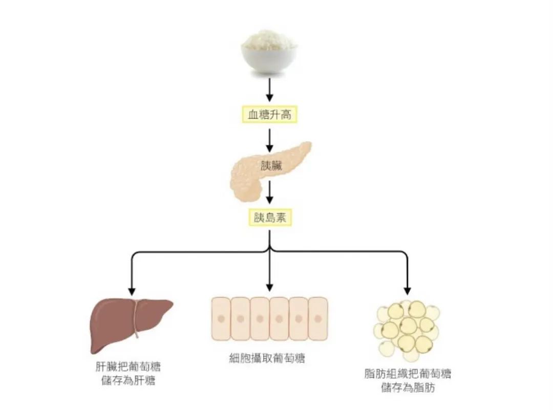 胰岛素是推动身体转换营养和能量的核心荷尔蒙,让肝脏将多余的糖分转成肝糖和脂肪,让过多的糖进入脂肪细胞来储存为脂肪。此外还帮助细胞取得胺基酸、合成蛋白质,同时也阻断蛋白质、肝糖和脂肪的分解。