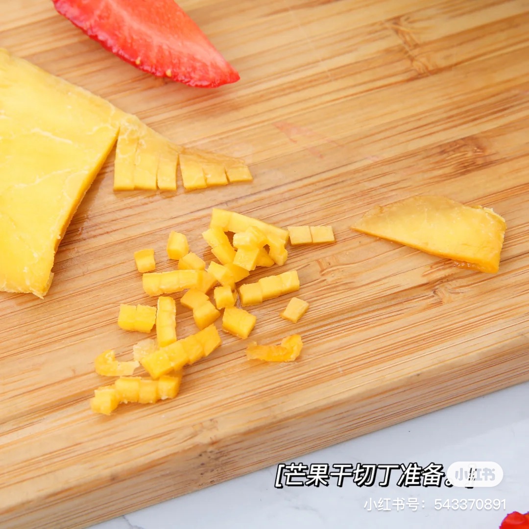 1️⃣芒果干🥭、草莓🍓、青桔切丁切块准备