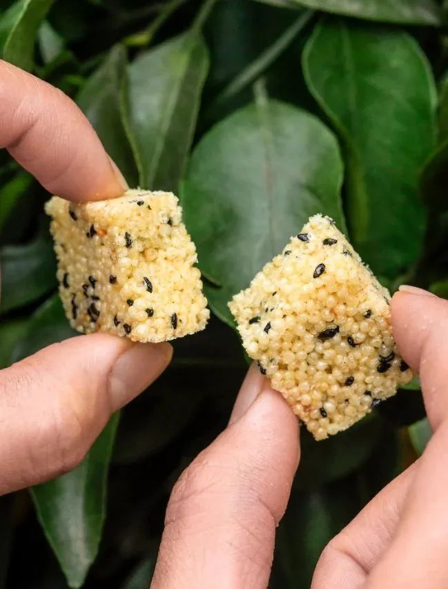 当山西太行山上的压塌楼小米,遇上四川蒲江的生态耙耙柑,一份自然无添加的柑橘味小米酥就诞生了。