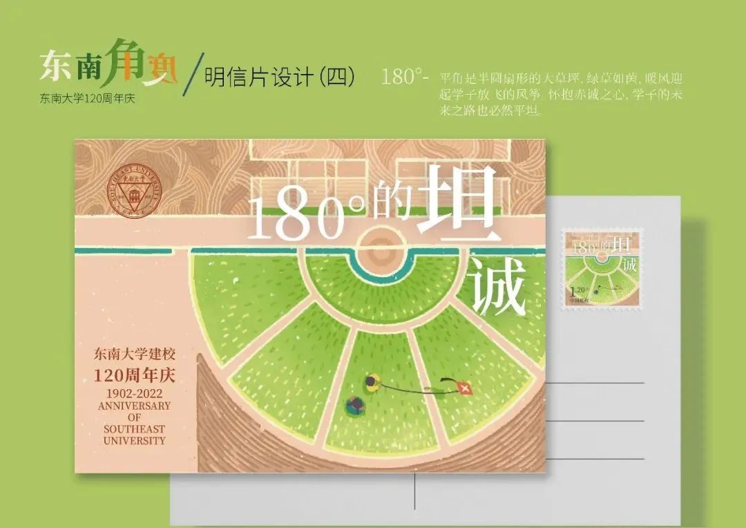 邮票背景采用东大的黄-绿色系、红移产生的较为温和的春天色调,寓意120年的东大依旧春意盎然,既怀抱历史也充满活力。