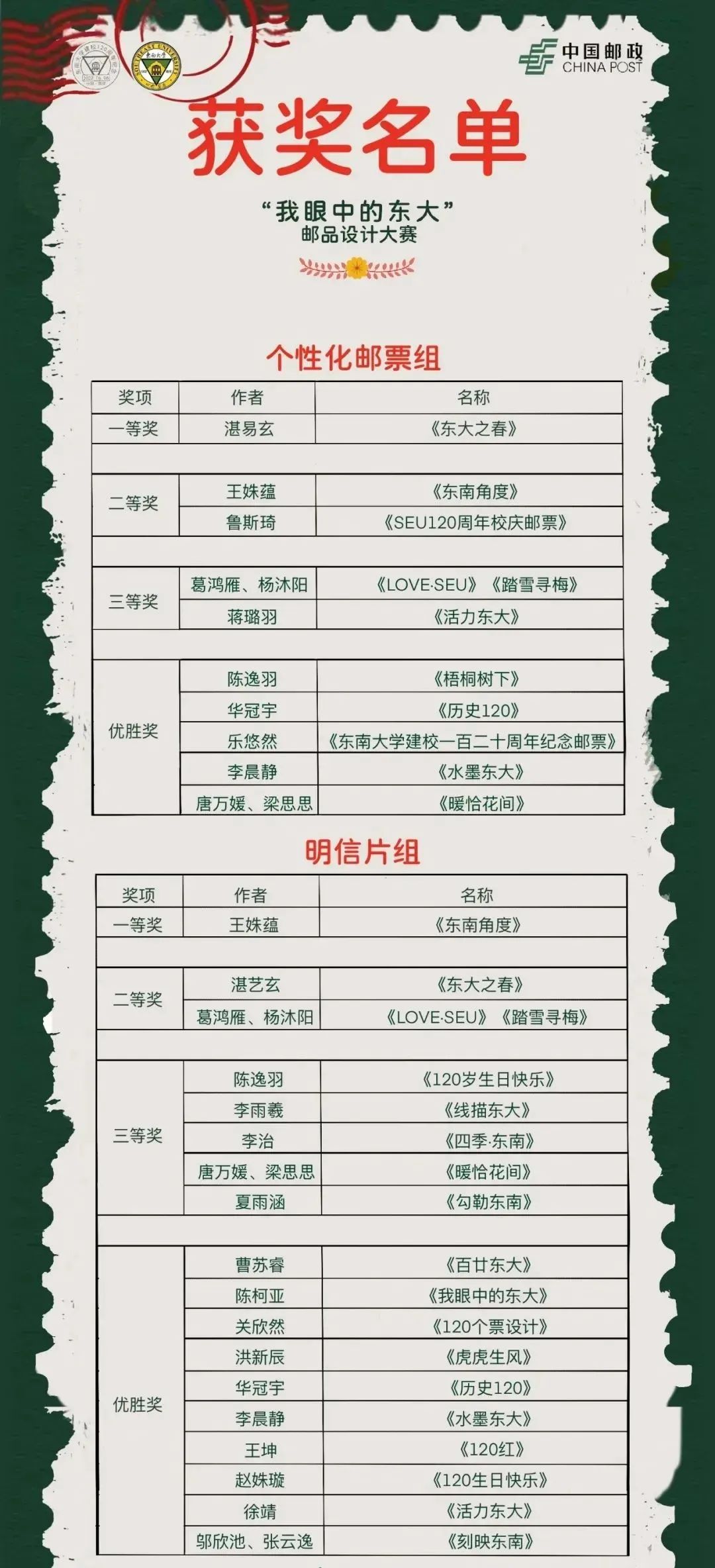 2021年12月邮政携手东南大学开启了“我眼中的东大”邮品设计大赛。自举办以来,得到了广大师生校友以及社会各界人士的热情支持与参与。经过大赛组委会专业评审讨论后,评选出各参赛组的一、二、三等奖以及优秀奖,现予以公布。
