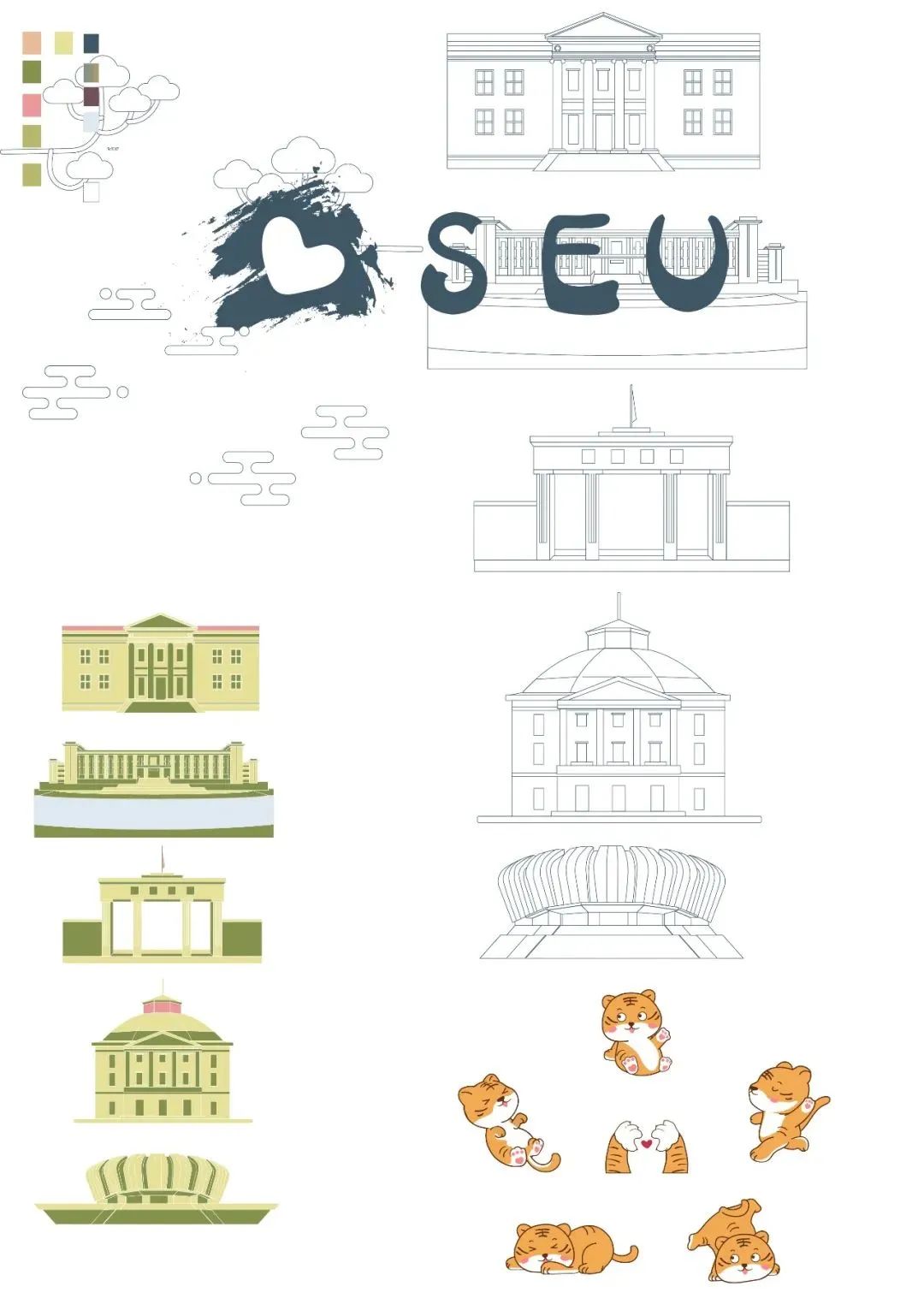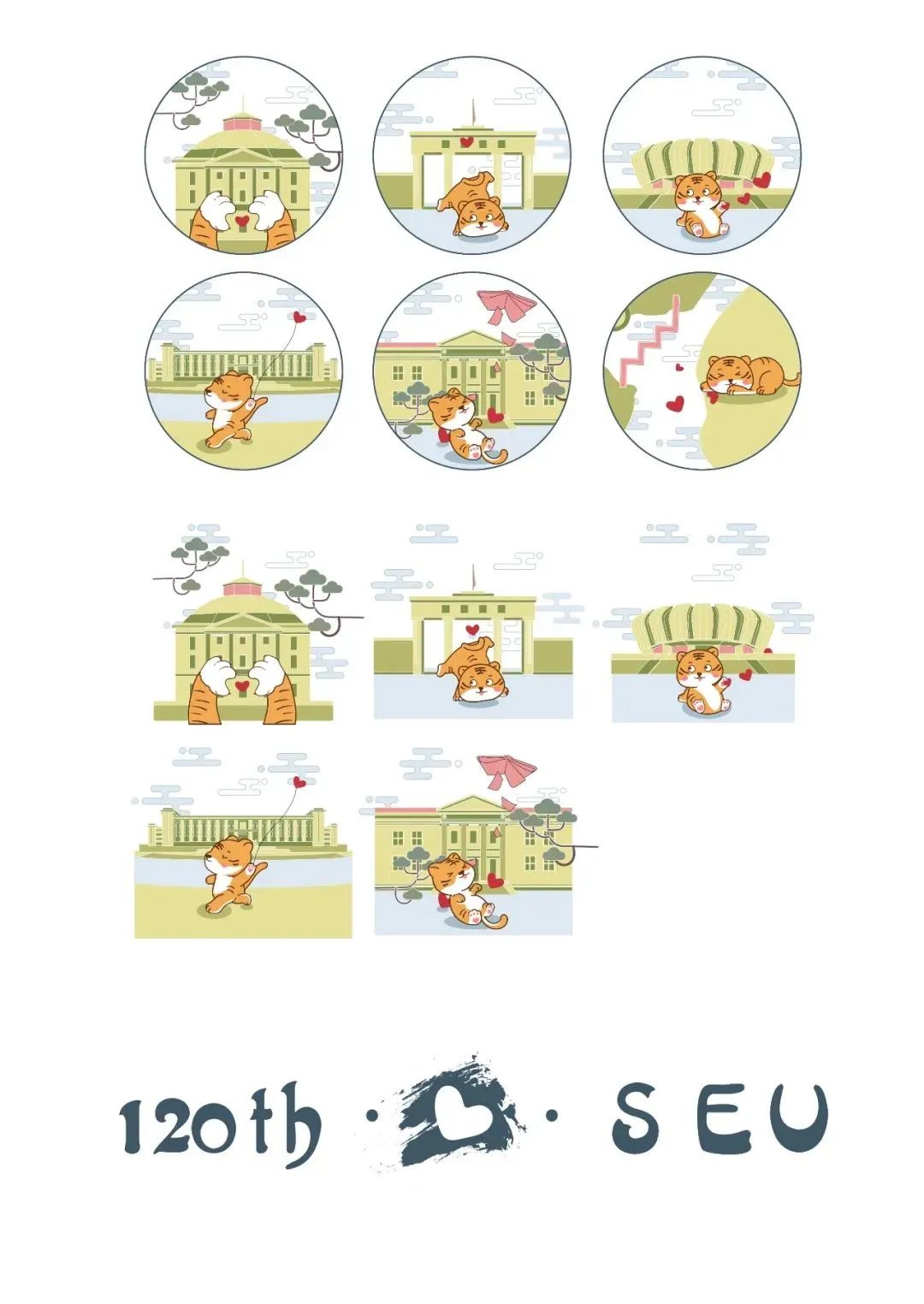 以120周年谐音“要爱您”为创作灵感,创作“SEU·LOVE”的系列插画。以东大六个标志性建筑为主要视觉场景,并融入120周年生肖元素,展现出学生与校园之间的欢乐与和谐。