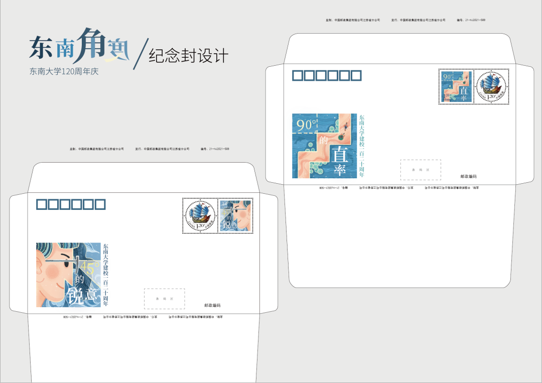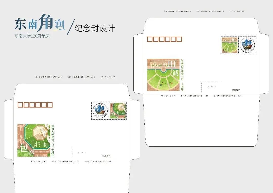 邮票边饰运用了线条和文字,颜色运用了蓝、绿、黄、白。简单的线条装饰更容易突出SEU120周年校庆的主题,让邮票更有整体感和形式感。