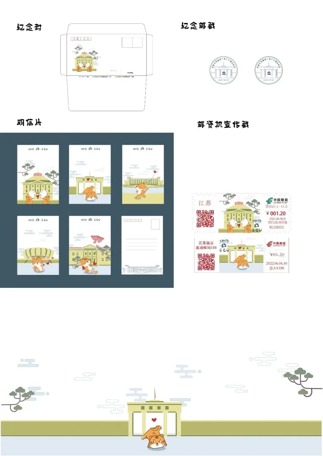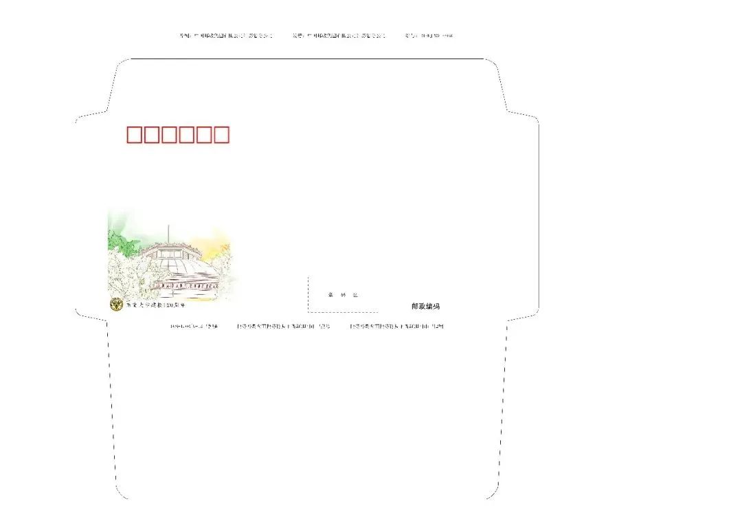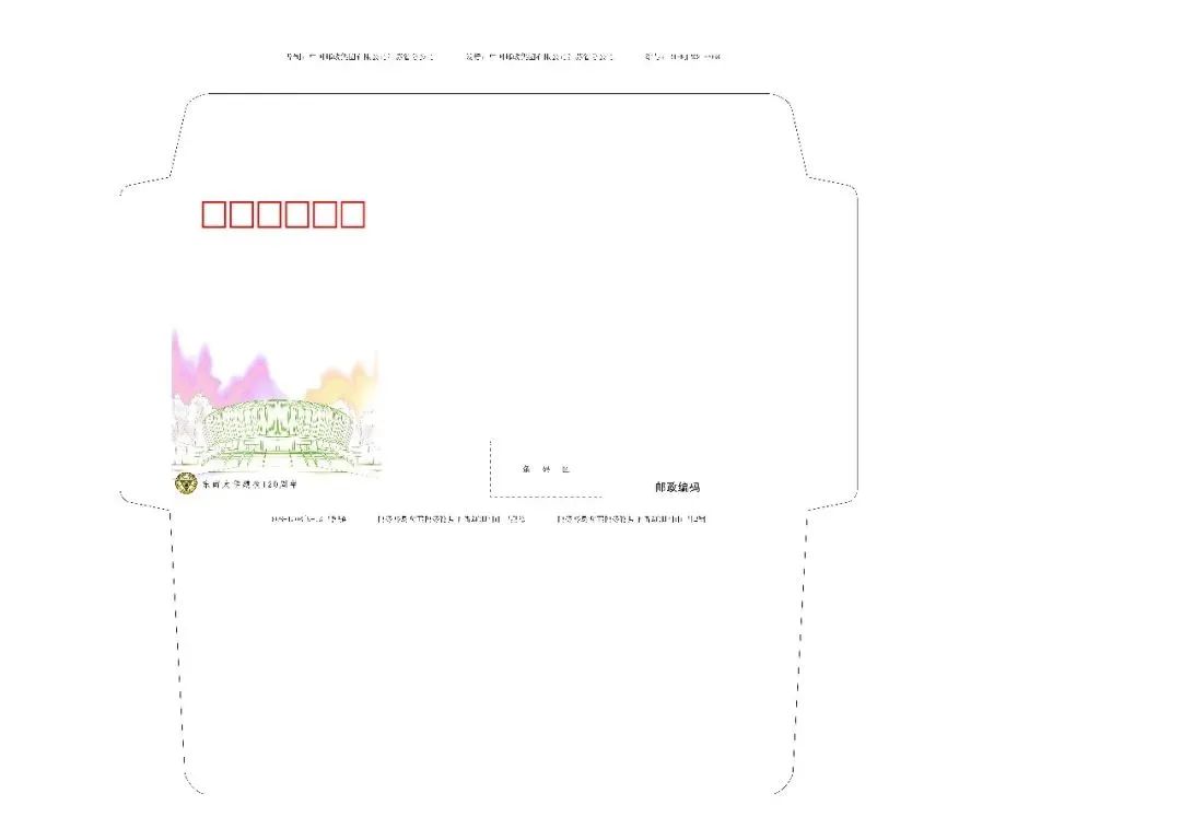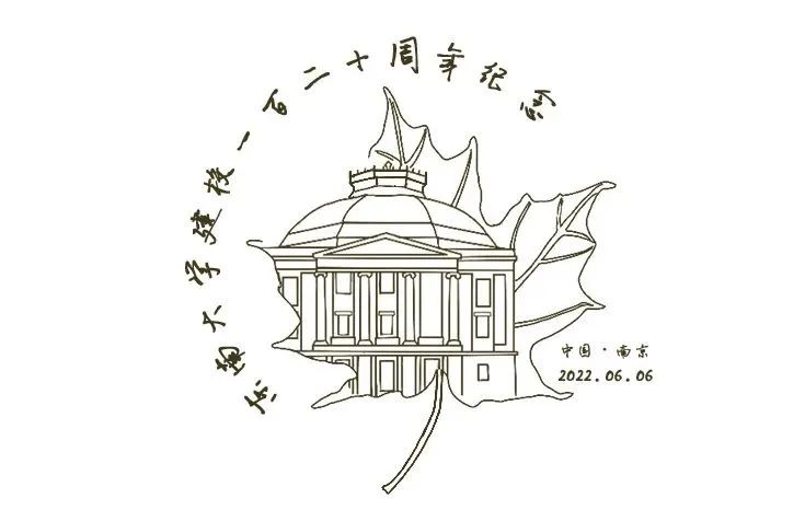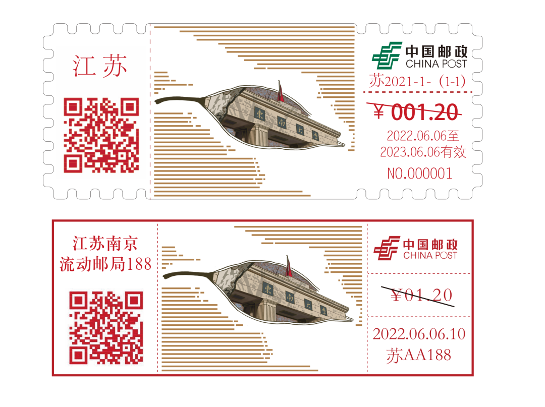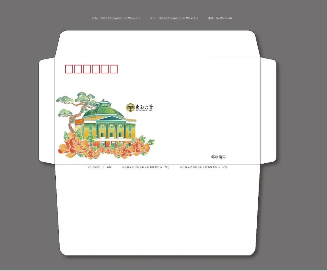 邮资机宣传戳设计图案采用的是东南大学南校门,外围用南京的特色植物香樟树的香樟树的形状叶进行勾勒。图案外用长短不同的横线填充背景,和明信片的横线设计呼应。