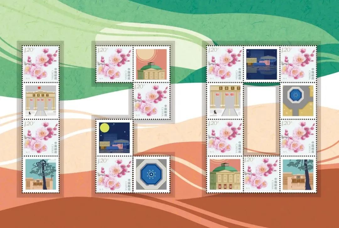 邮票通过扁平插画风格绘制了东南大学校园代表性建筑,以鲜艳活泼的撞色,带来具有冲击力的视觉体验展现校园的活力。边饰除了校标、校训等基本元素还加入了梅花的纹样和主票相呼应。
