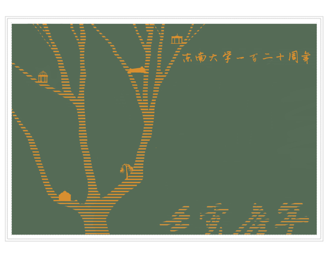 明信片设计图案采用的是横线组成的梧桐树剪影和“壬寅虎年”的字样。梧桐树上又有大礼堂、宿迁玫瑰园、 六朝松、李文正图书馆、南校门等剪影设计。右上方是“东南大学一百二十周年”字样点明主题。颜色采用和东南大学配色相近的绿色和橘黄色。