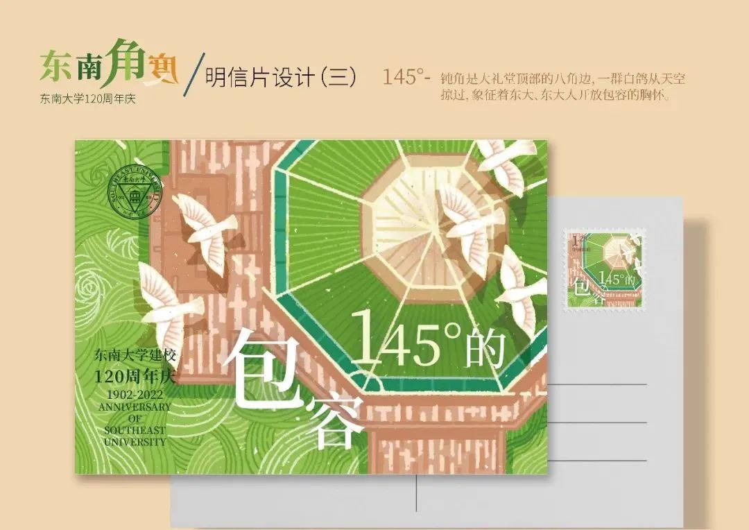 插图设计选择了东大独特的景色——四牌楼校区的大礼堂和九龙湖校区的体育馆作为明信片和纪念封设计的主体。背景采用明快的色彩体现校园蓬勃的朝气,建筑物采用简单的线条和清淡的配色,体现我心中的东大。