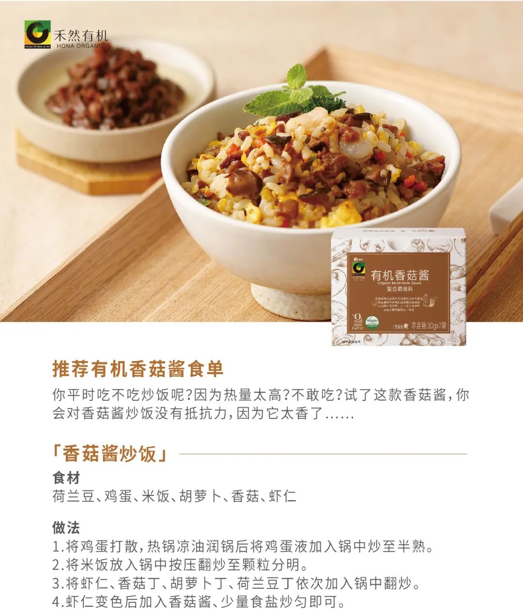 为最大程度保护香菇酱的营养和风味,禾然有机将有机香菇、有机豆瓣酱在有机葵花籽油中文火慢熬,天然豆香与菇鲜融合,使香菇颗粒鲜香嫩滑,酯香不腻,更好消化吸收~